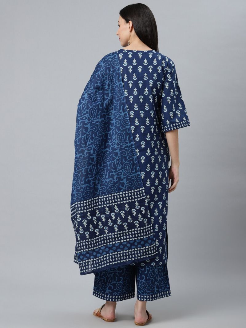 Blue Printed Rayon Straight Kurti With Palazzos & Dupatta